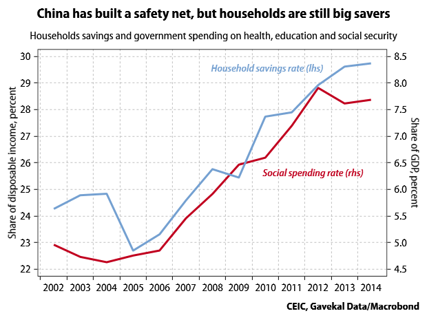 The interesting thing about this recommendation is that the Chinese government actually listened to it: in 2006, government spending on education, health care and social security started to rise sharply. Of course, this did not happen just because the IMF said so. The precautionary savings hypothesis was not only plausible, but also in sync with domestic political trends. A growing chorus of influential domestic scholars were also pushing for a stronger government safety net, since the old one provided indirectly by state-owned enterprises had broken down. The economic argument that this would lower the savings rate and boost consumption was eagerly adopted by this group of people, but, in my experience anyway, they were driven mainly by social concerns. The resulting expansion of the social safety net was the signature accomplishment of the Hu Jintao-Wen Jiabao administration. One thing it did not do, however, was lower the savings rate: social spending went up, and the savings rate kept rising.