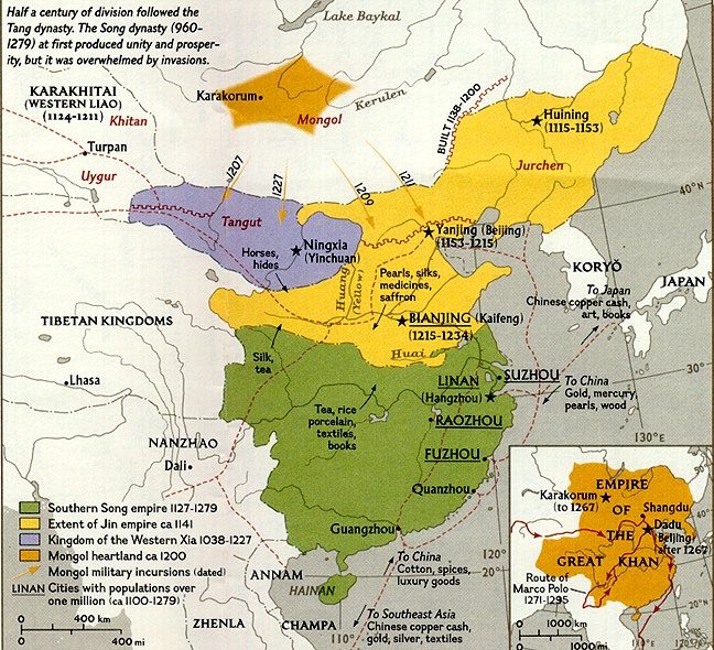 In the early thirteenth century, before the Mongols took over, East Asia was split into three hostile powers locked into a military equilibrium: the western Xia and the Jin to the north, and the southern Song to the south and along the coast. If the Mongols had not shattered this equilibrium (and no other nomadic mega-empire had taken their place), then China might well have remained divided, and the southern Song would have continued to prosper.