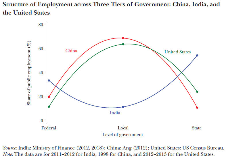After doing a round of India-China comparisons that focused on commonly cited macro indicators like manufacturing, investment and literacy (see last month’s post “India and the invidious comparison with China“), I wanted to highlight a lower-profile but perhaps even more interesting contrast: the structure of government and the nature of decentralization in large countries. One of the coolest China-India charts I have seen is in a 2020 article in the Journal of Economic Perspectives by Devesh Kapur, “Why Does the Indian State Both Fail and Succeed?” It shows how public employees in India, China and the US are distributed across different levels of government: